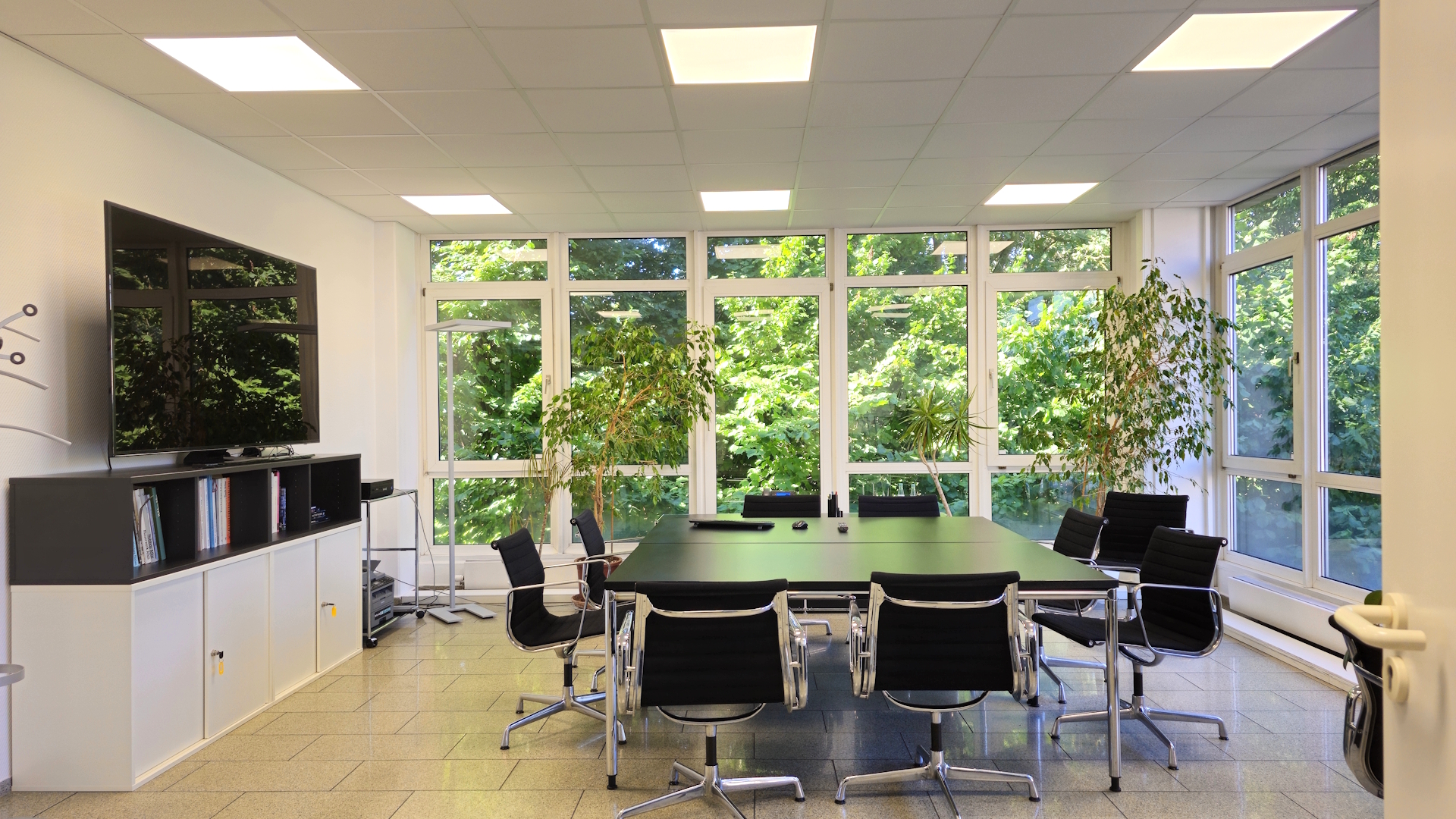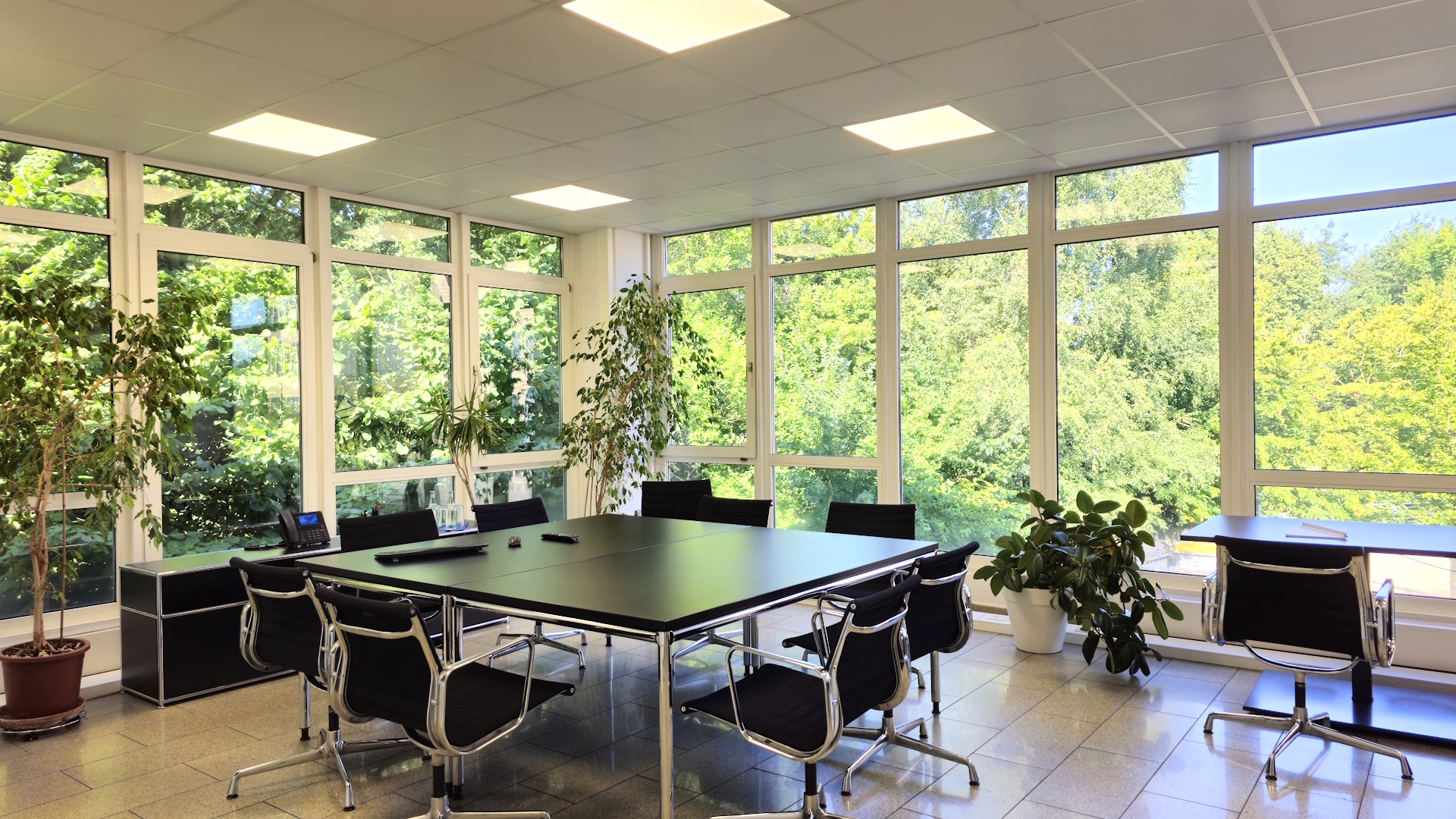 Der repräsentative Eingangsbereich mit verglastem Treppenhaus, Marmorbelägen und Glasaufzug bietet ein elegantes Entreè.