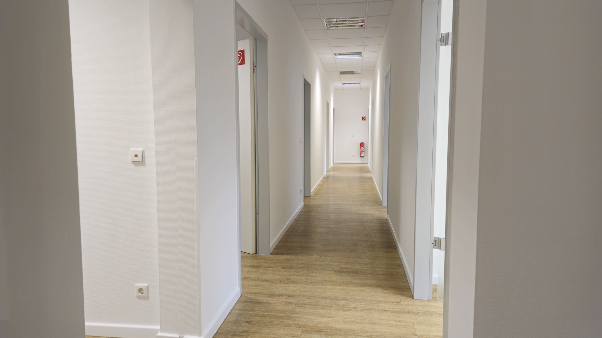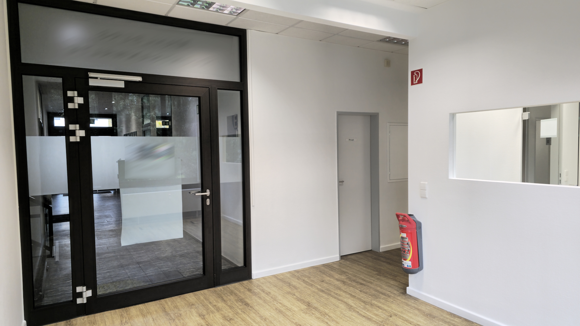 - Bürotüren, WC-Anlagen, Küche und Serverraum: weiße Holztüren