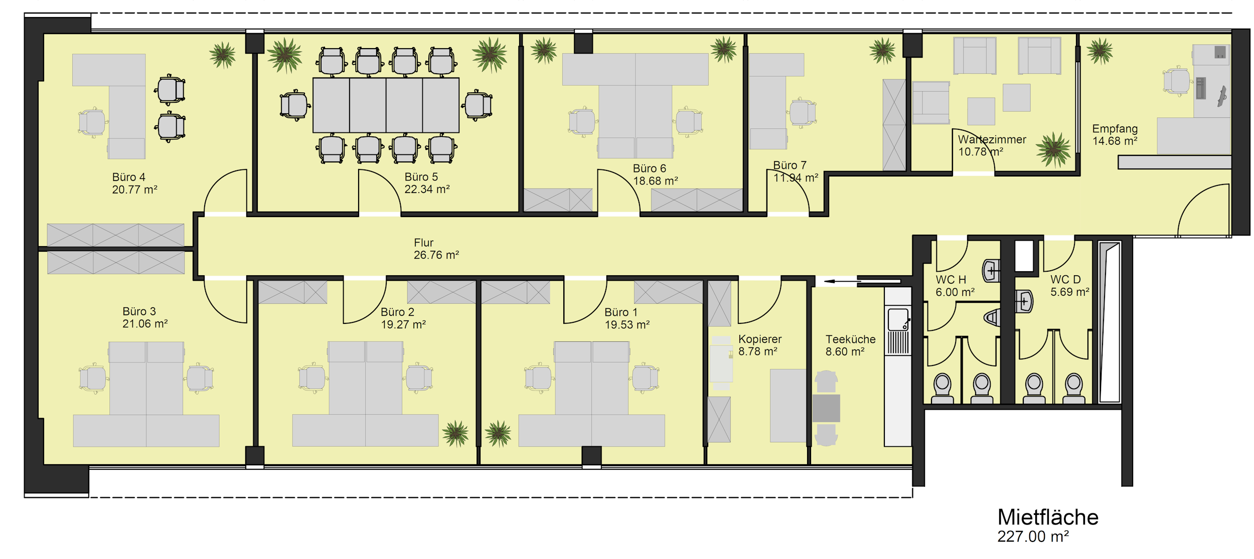 Die moderne Büroetage liegt im Erdgeschoss des Gebäudes und ist über den Gebäudezugang Godesberger Allee 125 zu erreichen. Die Büroetage wurde bisher durch eine Kanzlei genutzt, die in eine größere Etage im Gebäude umgezogen ist.