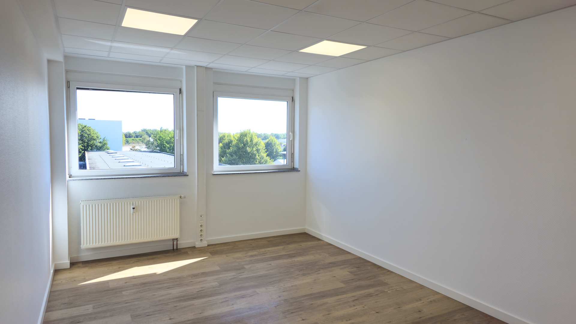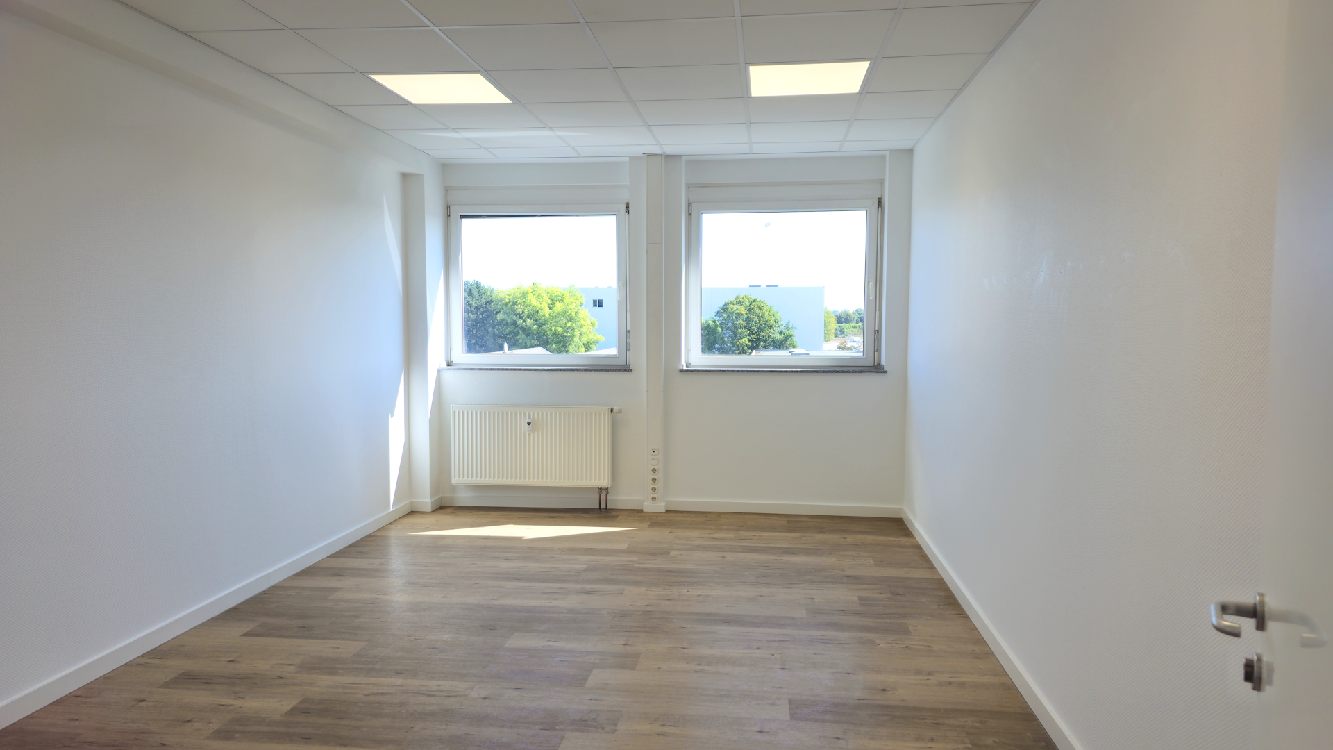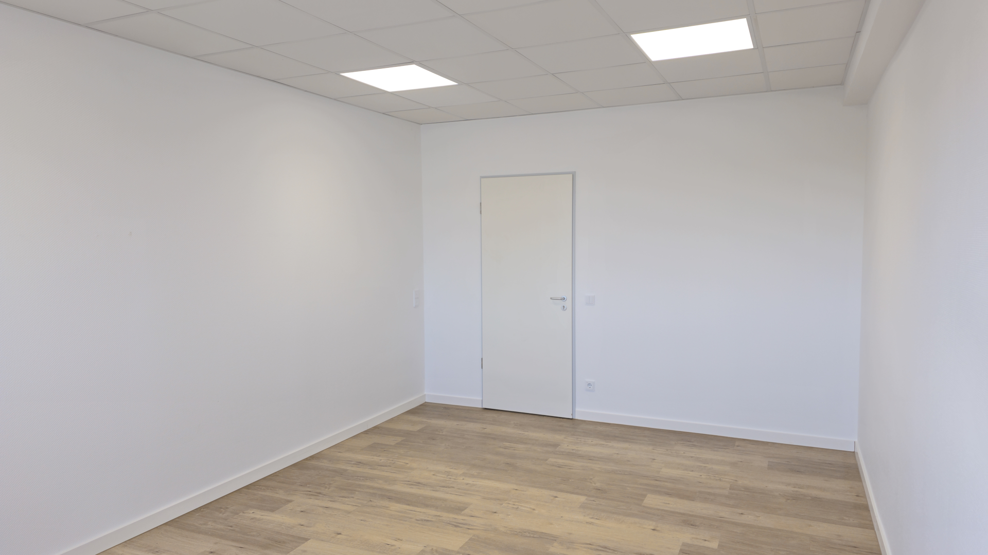 Die lichthellen Büroräume sind mit einem modernen PVC-Designboden in Holzoptik ausgelegt und die Wände mit einer Glasfasertapete tapeziert.